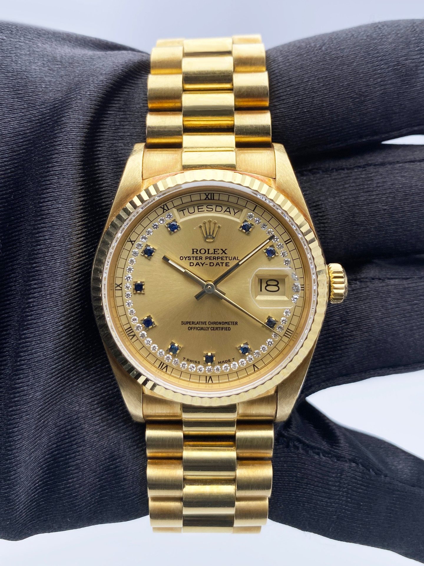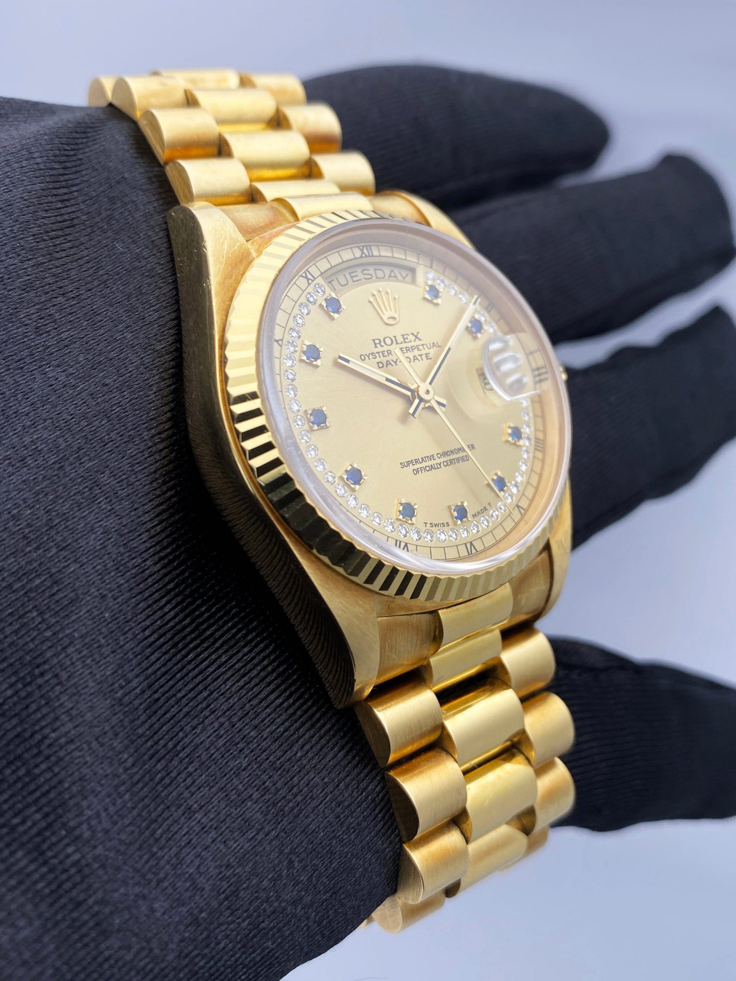 Rolex Day-Date 18038 String Diamond Sapphire Champagne Dial Mens Watch Box Papers